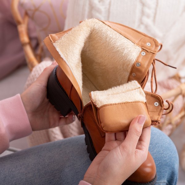 • Коричневі жіночі черевики на плоских підборах. Виготовлені з екологічної шкіри. Модель застібається на блискавку і зашнуровується. Черевики мають ніжне хутряне утеплення. Вони гарантують комфорт на щодень.