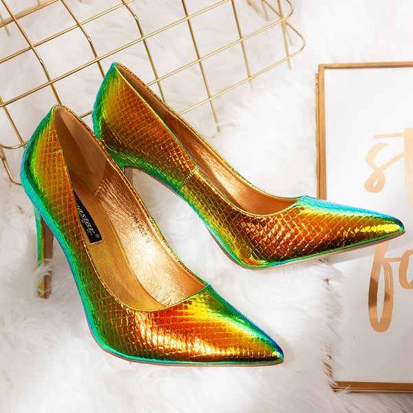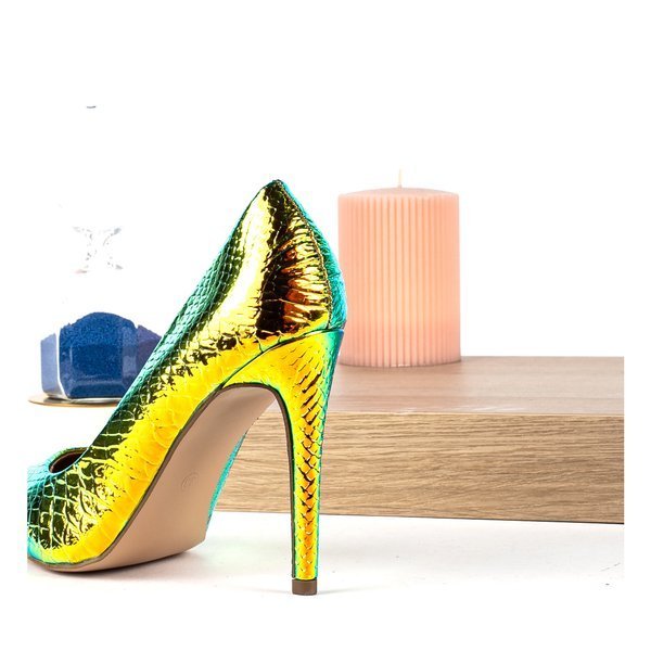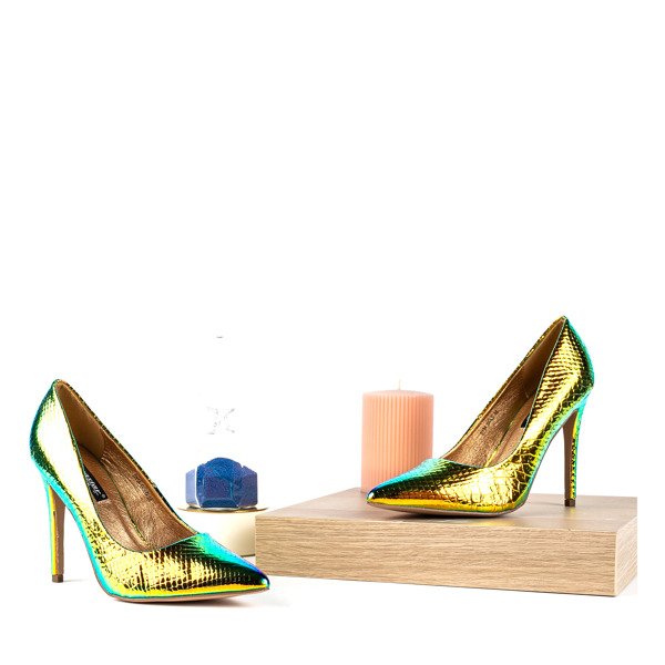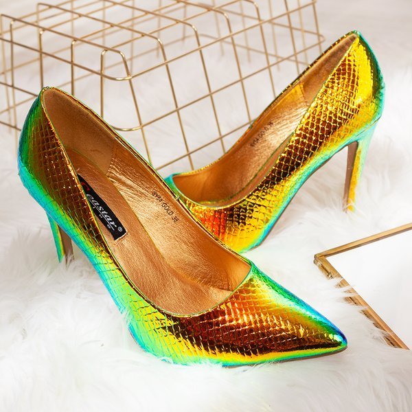 • Бездоганні туфлі-човники на високій шпильці із загостреним носком. Матеріал - еко-шкіра в золотому голографічному кольорі. Халявка має відтиски типу - зміїна шкіра. Представлені шпильки підходять до сміливих образів.