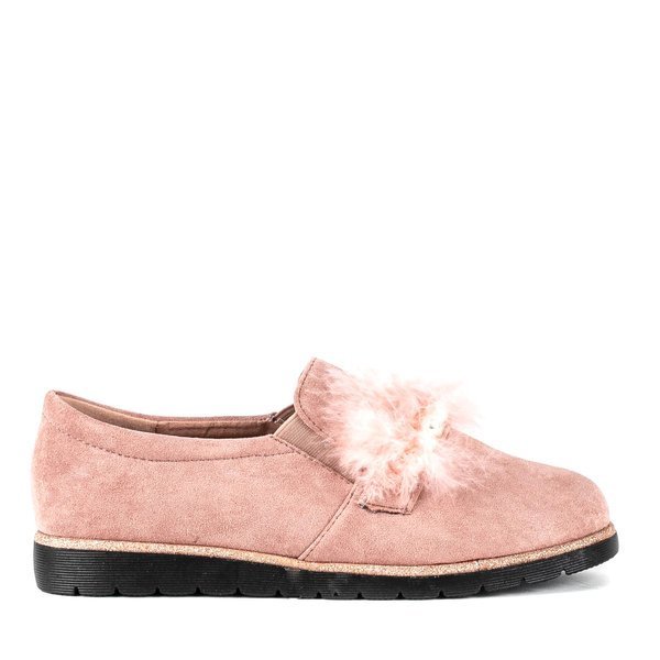 • Смачне жіноче взуття рожевого кольору. Верх виконаний з еко-замші, а устілка покрита екошкірою. Підошва декорована блискучим матеріалом. Взуття має орнамент у вигляді пір’я та перлів.