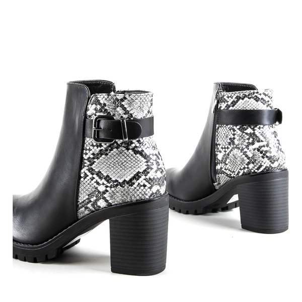 - Елегантні ботильйони на високій стійці. Матеріал виготовлений з екошкіри чорного кольору. Спинка верху імітує зміїну шкіру. Застібка на блискавці з внутрішньої сторони.
