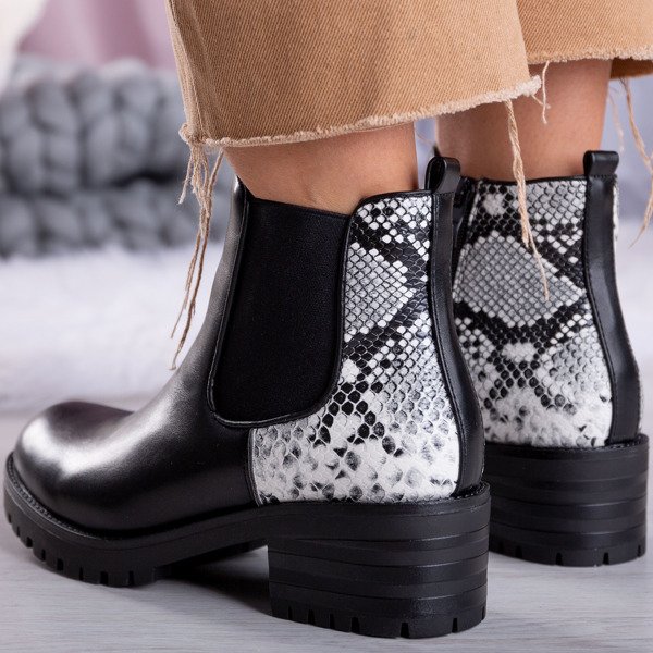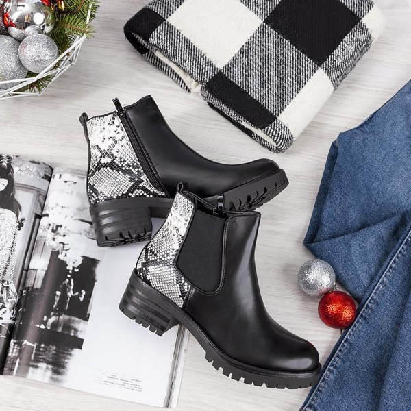 • Симпатичні черевики на низькому стовпі з круглим носком. Матеріал верху - екошкіра чорного кольору. Середина взуття трохи утеплена. Задня частина імітує зміїну шкіру. Застібка на блискавці з внутрішньої сторони.