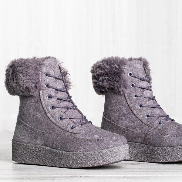 - Снігові черевики на платформі сірого кольору з коричневої еко-замші. Верхня частина верхньої має декоративне хутро. Модель на шнурівці. Ідеальне взуття для джинсів.