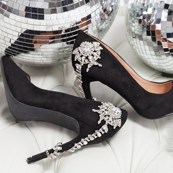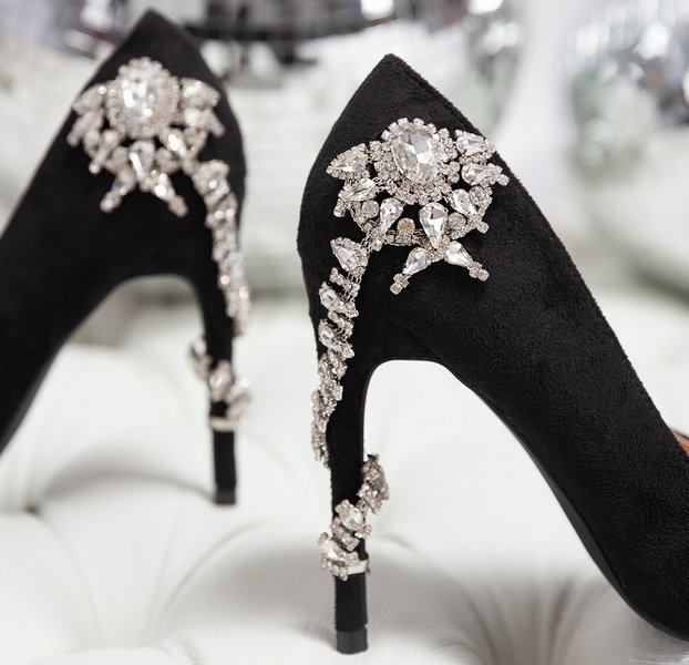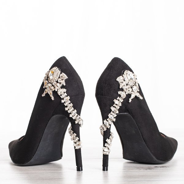• Елегантні шпильки з носом до кінця. Верх виконаний з еко-замші чорного кольору. Внутрішня частина взуття обшита еко-шкірою. Каблук і задня частина взуття прикрашені цирконами. Вражаюче доповнення до створення!