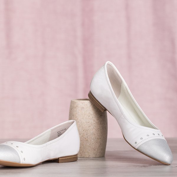 - Класичні балерини на плоских підборах для жінок. Верх виконаний з білої натуральної шкіри. Інтер'єр взуття та устілки, облицьований натуральною шкірою. Вони підходять для офісного стилю.