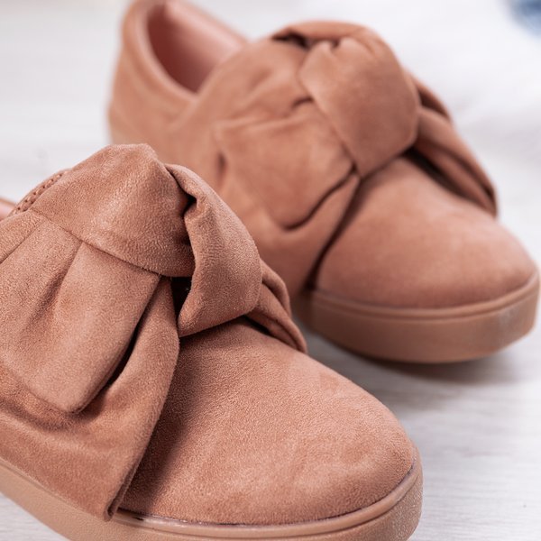 • Кросівки ковзають на плоскій підошві. Верх виконаний з рожевої замші з еко-шкіри. Підкладка - екошкіра. Представлене жіноче взуття прикрашене бантом. ПРИМІТКА: Модель може мати сліди клею на підошві!