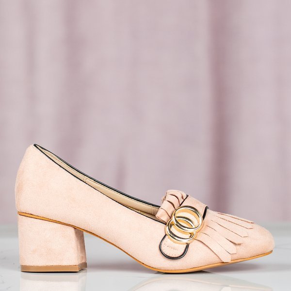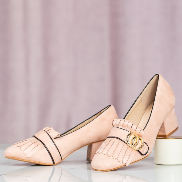 - Елегантні рожеві насоси на низьких підборах та з квадратним носком. Верх виконаний з еко-замшевої шкіри з устілкою з еко-шкіри. Ніс прикрашений китицями та золотими кружечками. Ідеально підходить для офісного стилю.