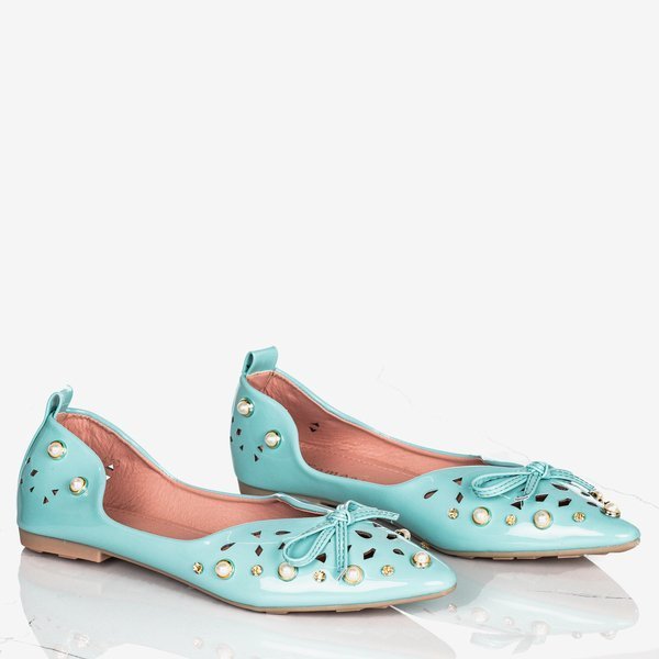 - Жіночі балетки з монетного двору з бірюзовим кольором із загостреним носком. Верхня частина має вирізи та орнаменти у вигляді фіаніту та перлів. Внутрішня частина взуття виконана з екошкіри. Представлене жіноче взуття ідеально підходить для елегантних сти