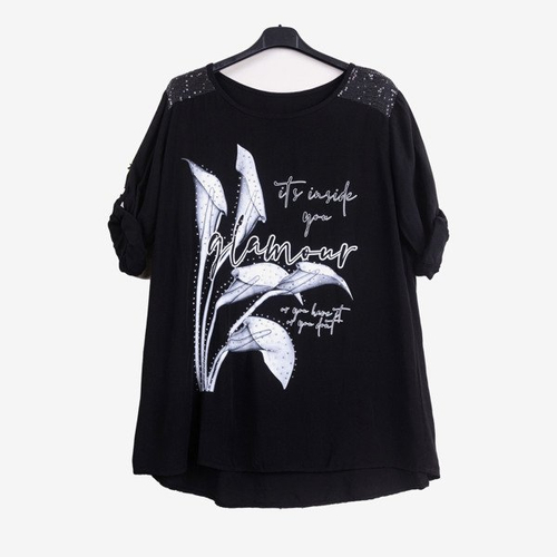 - Жіноча туніка великого розміру з віскози. Рукава мають застібку на ґудзики. Модель прикрашена квітковим принтом, написами та фіанітами. ПРИМІТКА: Точність вимірювання (+/-) 1 см.