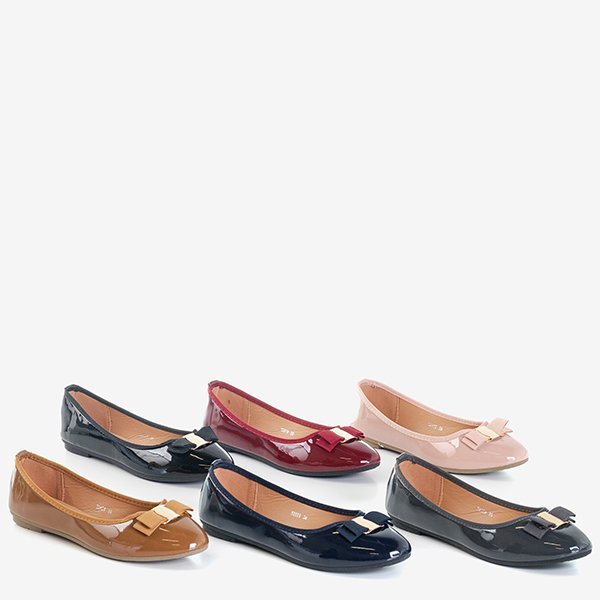 - Елегантні балерини з плоским каблуком з круглим носком. Матеріал виконання - лакована еко-шкіра. Наконечник прикрашений бантиком із золотим елементом. Посередині м'яка устілка з еко-шкіри. Примітка: модель має дуже вузький верх!