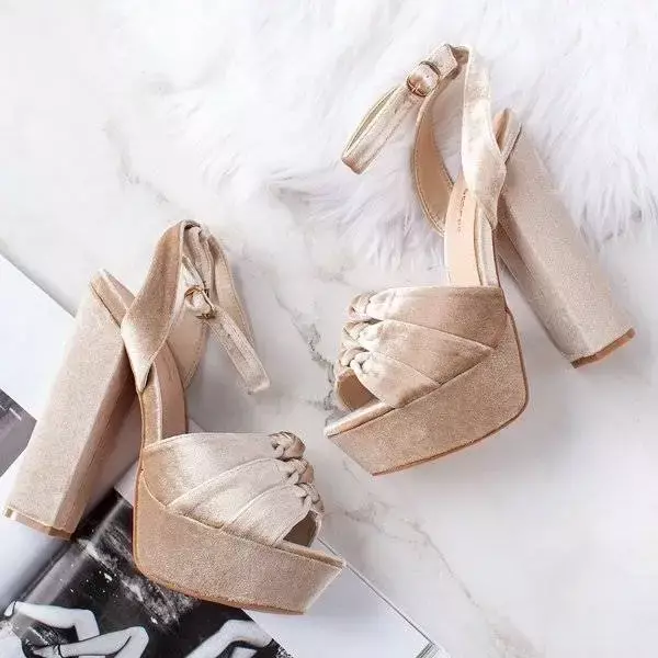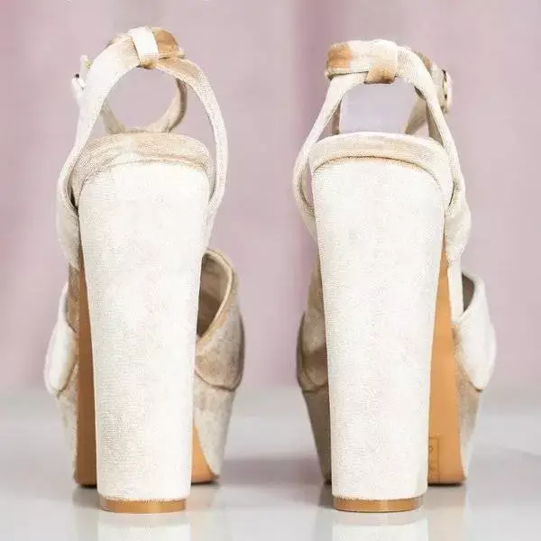 • Бежеві босоніжки на високих підборах з велюрового матеріалу. Бордова кольорова модель. Жіноче взуття застібається пряжкою на щиколотку. Ідеальне взуття для теплих днів. Примітка: виріб має сліди клею на матеріалі.