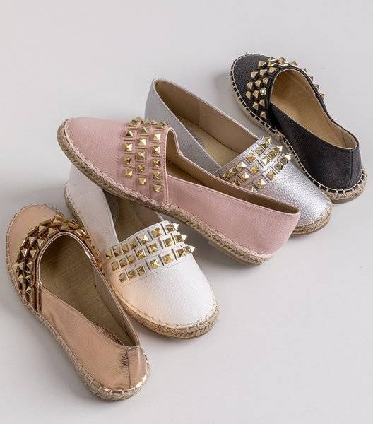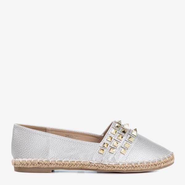 - Срібні жіночі еспадриси на плоскій підборі. Верх виконаний з еко-шкіри, устілки, підкладені тканиною. Ніс прикрашений золотими шпильками. Плетений джутовий шпагат навколо підошви. Взуття,