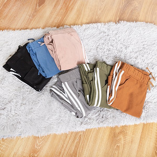 - Спортивні штани з еластичної тканини. Модель має резинку в поясі та внизу штанин, а також 4 кишені. Штани оздоблені лампасами по боках.