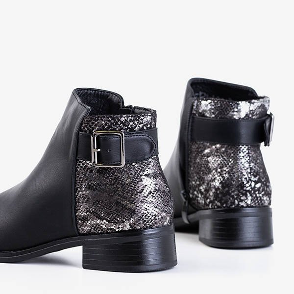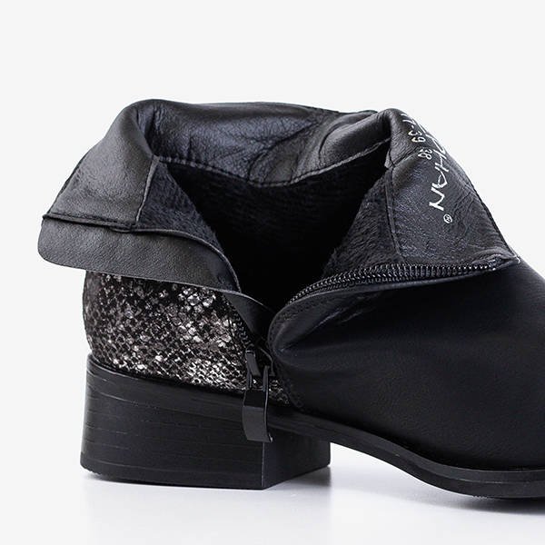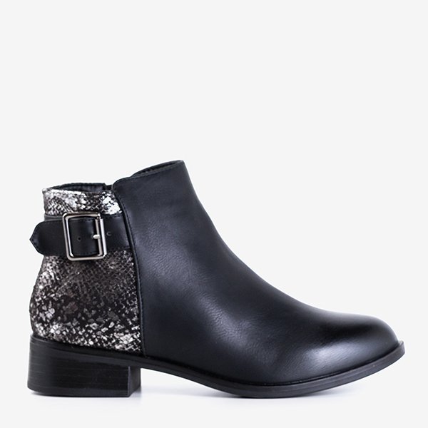 - Оригінальні жіночі черевики на плоских підборах чорного кольору. Верх виготовлений з екологічної шкіри, в задній частині є тканинна вставка, яка прикрашена принтом зі зміїною шкірою. Модель застібається на блискавку збоку.