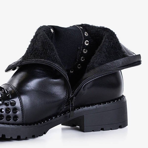 - Привабливі жіночі черевики на плоских підборах. Верх виготовлений з екологічної шкіри, прикрашений шпильками. Туфлі, застібаються на блискавку, з підкладкою хутро всередині. Вони підходять для багатьох оригінальних стилів.