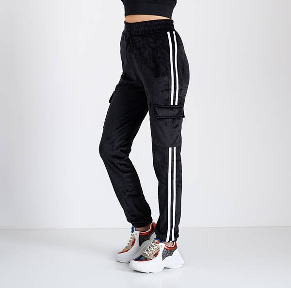 - Спортивні штани з ала-велюрового матеріалу. Модель має: гумку на талії та ногах та 4 кишені. Спортивні костюми, прикрашені білими смужками з боків ПРИМІТКА: Точність вимірювання (+/-) 1 см.