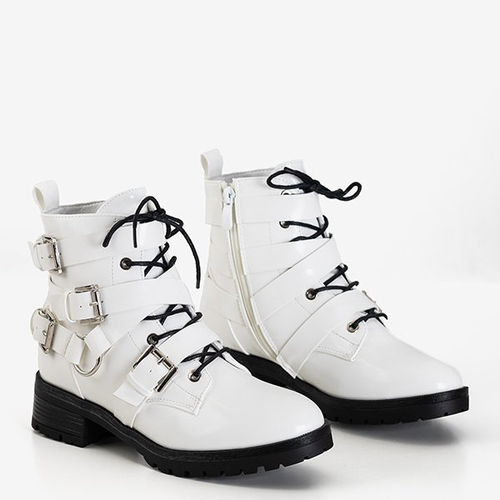 • Жіночі черевики на плоскому підборі в стилі робітники. Верх виготовлений з екологічної шкіри білого кольору і прикрашений смугами з пряжками. Взуття на шнурівці на блискавці. Модель утеплена ніжним хутром.