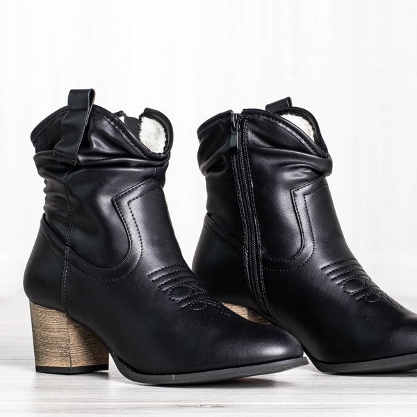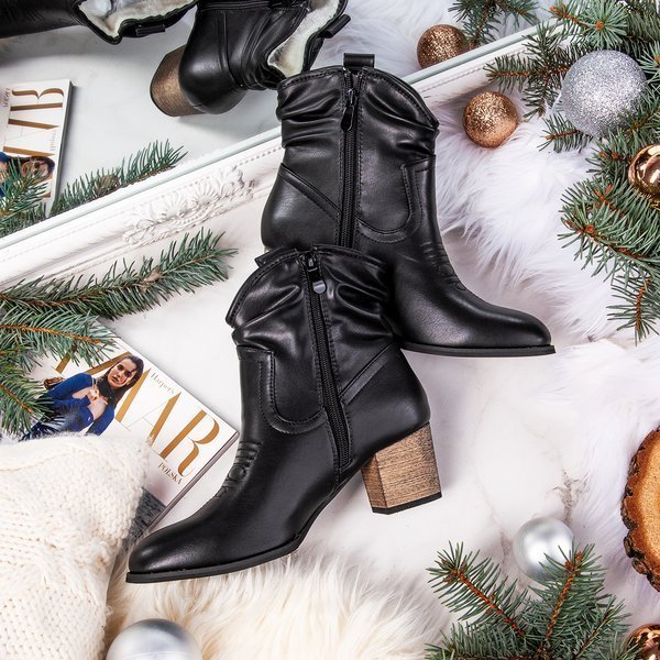 • Неймовірно зручні жіночі ковбойські черевики на дерев'яному каблуку. Верх виконаний з екологічної шкіри чорного кольору. Всередині вони утеплені хутром. Примітка: на підошві тріщина.