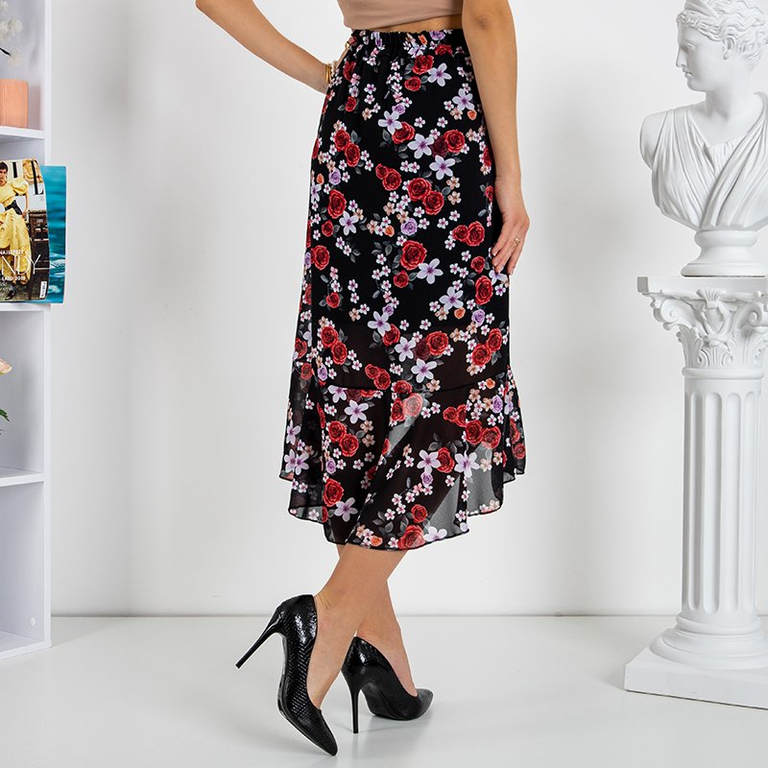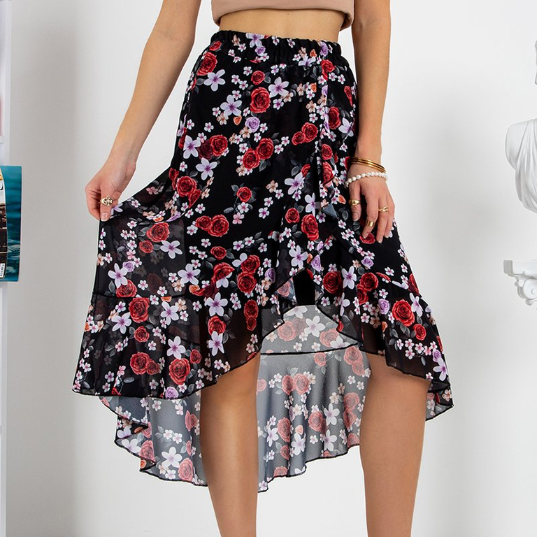 Чорна асиметрична спідниця з червоним квітковим принтом