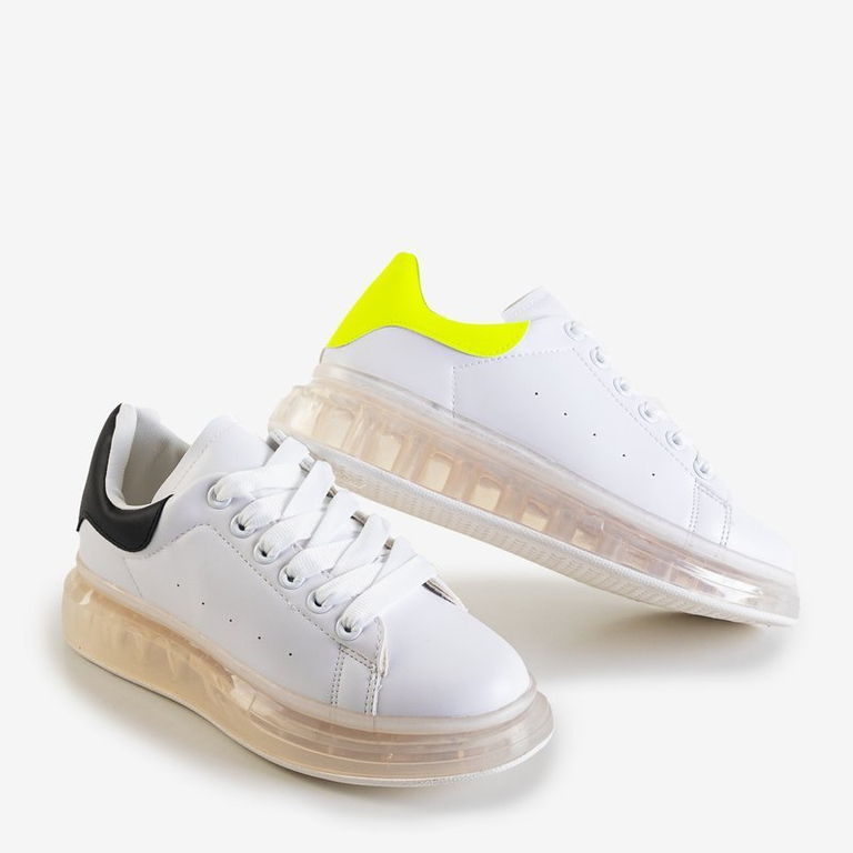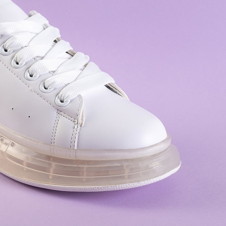 - Стильні кросівки з екологічної шкіри білого кольору. Модель на шнурівці, оздоблена кольоровою вставкою. Прозора підошва з гумового матеріалу надає унікальність.