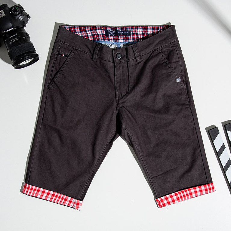 - Чоловічі короткі шорти довжиною до колін. Виготовлені з м’якої бавовняної тканини. Модель з манжетами в клітинку, має 4 кишені.