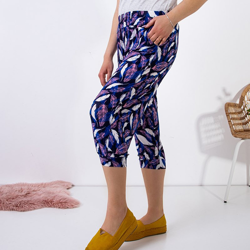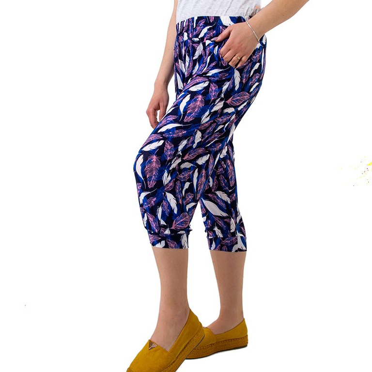 - Жіночі бриджі виготовлено з бавовняної тканини та оздоблено візерунком. Модель має резинку в поясі та внизу штанин, а також дві кишені. Чудова пропозиція для теплих літніх днів!