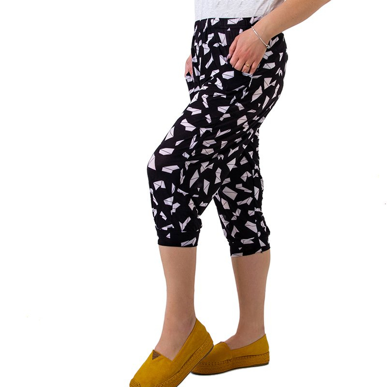 - Жіночі бриджі виготовлено з бавовняної тканини та оздоблено візерунком. Модель має резинку в поясі та внизу штанин, а також дві кишені. Чудова пропозиція для теплих літніх днів!