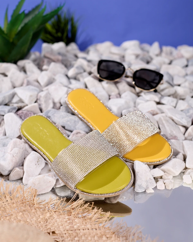 - Жіночі шльопанці, прикрашені стразами. Ремінець виготовлений з пластику, устілка - з екологічної шкіри.