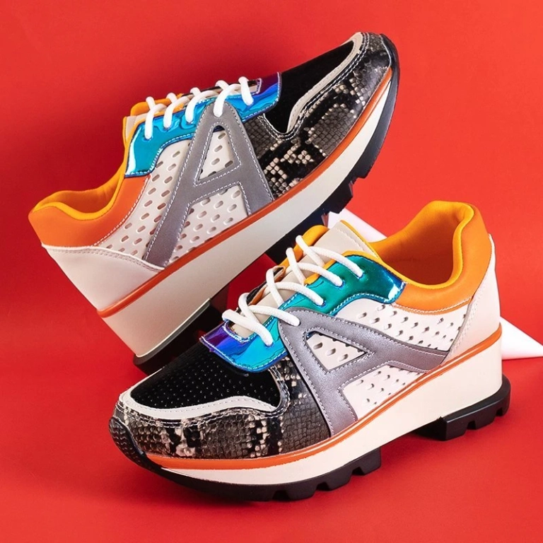• Яскраве жіноче спортивне взуття на масивній оригінальній підошві. Верх виготовлений з екологічної шкіри з перфорацією. Модель оздоблена голографічними вставками та елементами, що імітують зміїну шкіру.