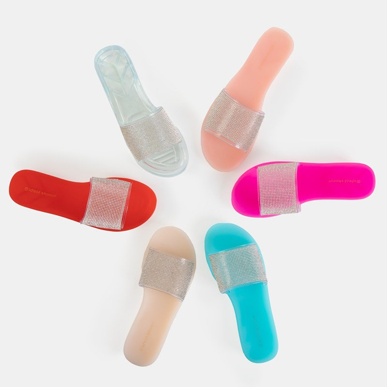 - Жіночі шльопанці на плоскому каблуці, повністю виготовлені з гумового матеріалу. Ремінець, прикрашена дрібними стразами. Зручне взуття на літо!