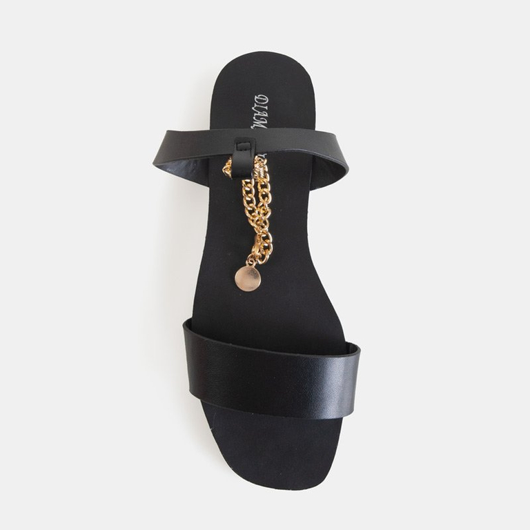 - Жіночі босоніжки на плоскому каблуці. Виготовлені з екологічної шкіри. Модель має декоративний ланцюжок, який можна застібнути навколо щиколотки. Зручне та стильне жіноче взуття на літо!