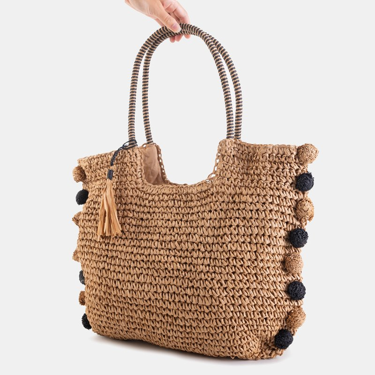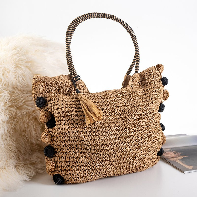 - Велика сумка з плетеної соломи, розміром А4. Модель має дві ручки та помпони з обох боків. Всередині підкладка та маленька кишеня. Сумка застібається на блискавку. Ідеальне доповнення до будь-якого літнього образу!