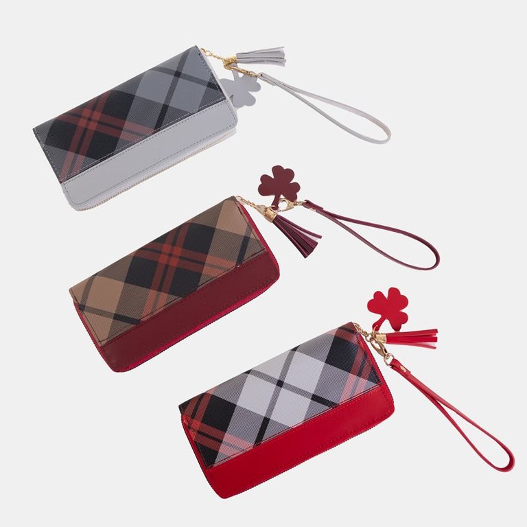 - Жіночий гаманець з екологічної шкіри з картатою обробкою, застібається на блискавку. Застібка-блискавка з бахромою. Модель має: - 2 відділення, в тому числі 1 з потайною кишенею, - 10 кишень, в тому числі 8 менших для платіжних карток або інших документів