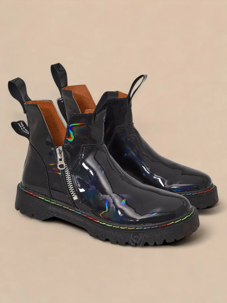 - Жіночі ботильйони виготовлені з комбінації гумового матеріалу та еко-шкіри з голографічним мотивом. Модель без утеплення, устілка всередині викладена еко-шкірою. Збоку вирізи та застібка на блискавку. Ідеальне жіноче взуття на прохолодні дні!