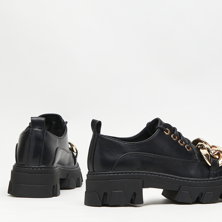 - Унікальні жіночі закриті туфлі з екологічної шкіри. Верх на шнурівці, прикрашений масивним золотистим елементом. Устілка також з екошкіри, підошва з гумового матеріалу. Модель, яка додасть "родзинки" у класичному образі!