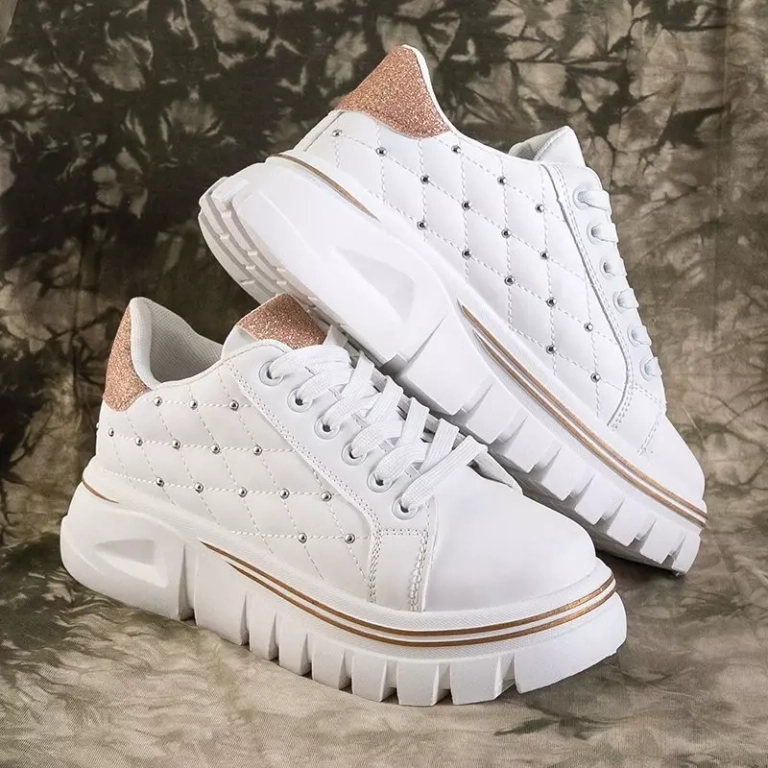 - Жіночі білі кросівки на платформі з екологічної шкіри. Верх прикрашений стьобанням із заклепками, а ззаду має блискучу вставку. Модель на шнурівці, інтер’єр обшитий тканиною. Примітка: продукт має зміну кольору на матеріалі.