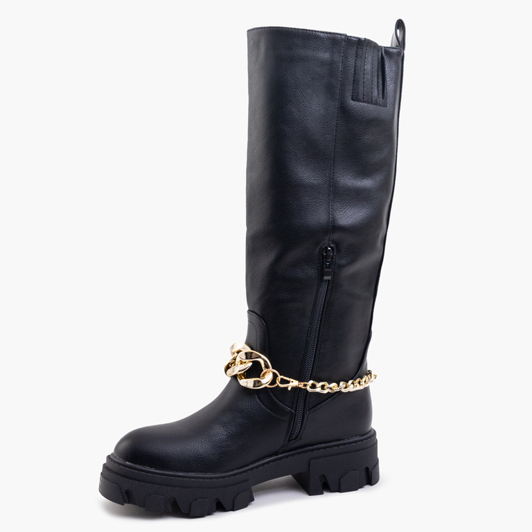 - Модні жіночі чоботи з еко-шкіри , оздоблені знімним ланцюжком в золотому кольорі. Взуття застібається на блискавку, всередині має тонке утеплення у вигляді хутра. Хіт цього сезону!