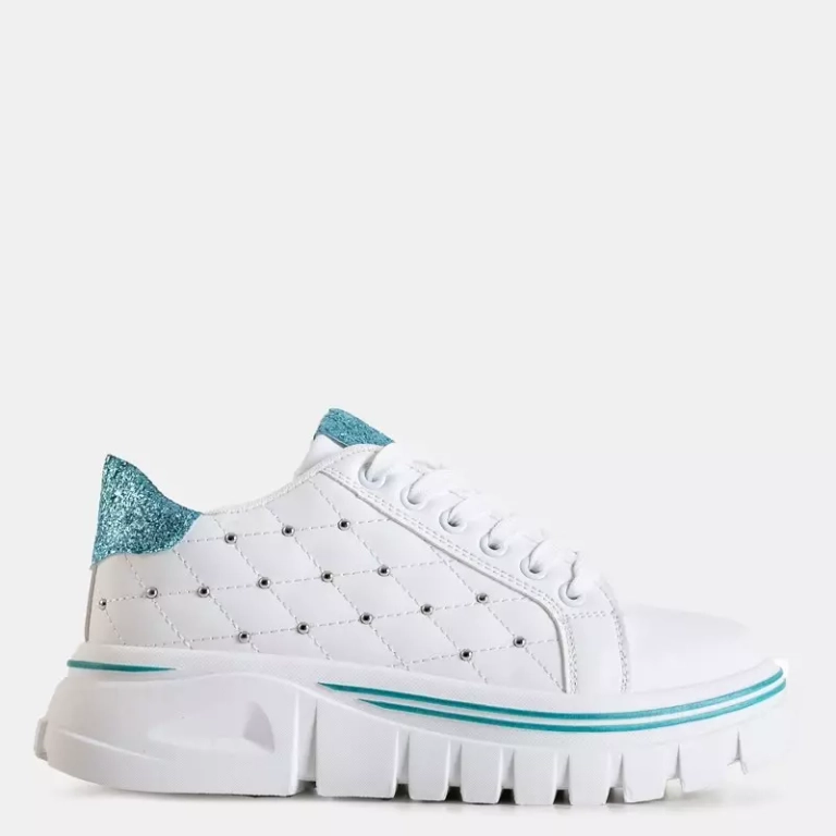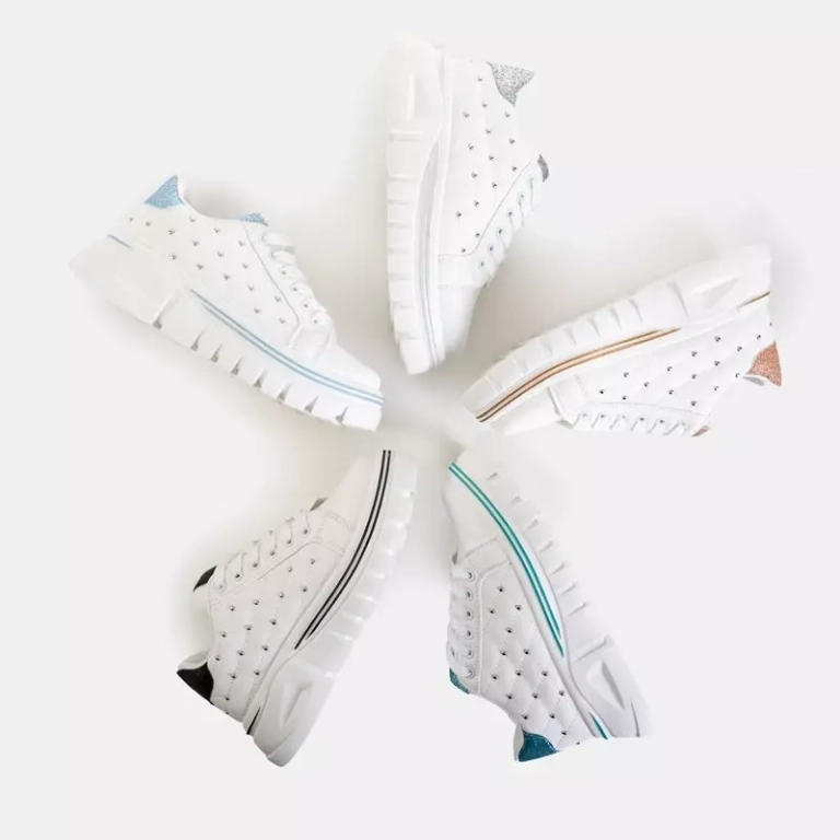 - Жіночі білі кросівки на платформі з екологічної шкіри. Верх прикрашений стьобанням із заклепками, а ззаду має блискучу вставку. Модель на шнурівці, інтер’єр обшитий тканиною. Примітка: на виробі є подряпини на матеріалі.