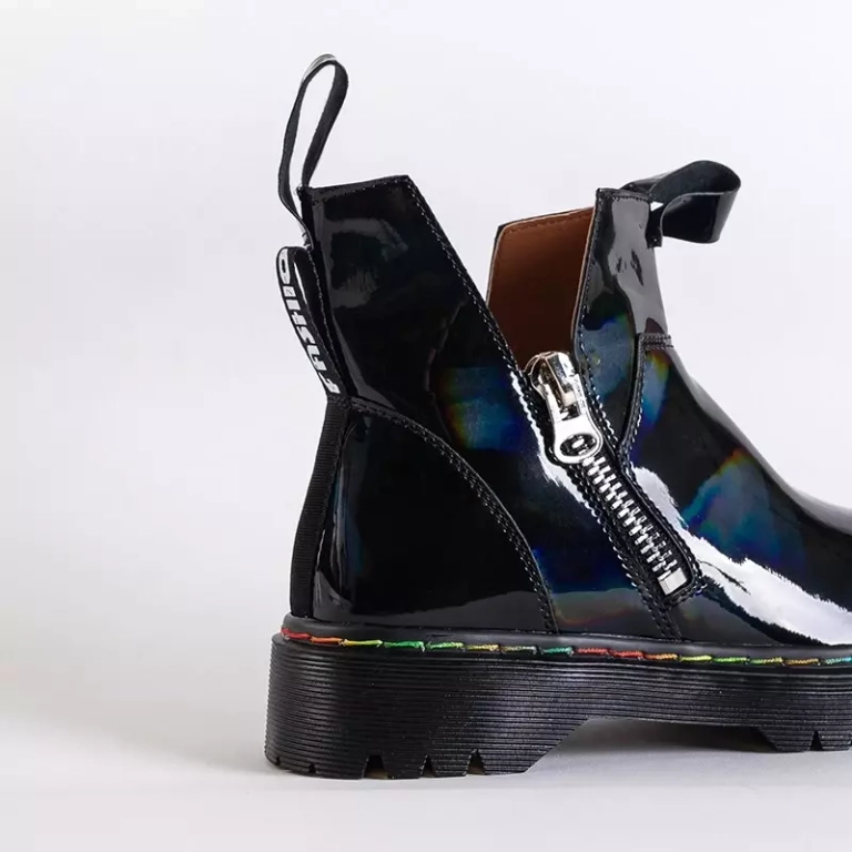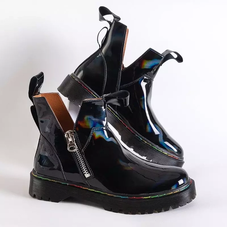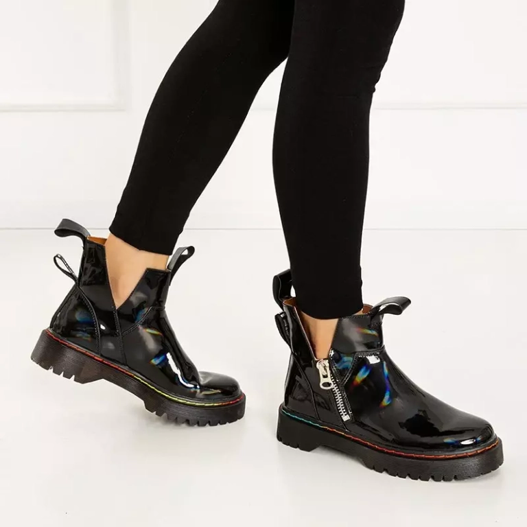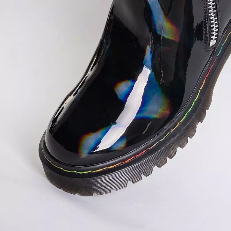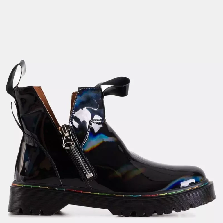 - Жіночі чоботи з поєднання гумового матеріалу та екошкіри з голографічним мотивом. Модель без утеплювача, устілка всередині обшита еко-шкірою. Вирізи збоку та застібка на блискавку. Примітка: виріб має пошкоджений матеріал.