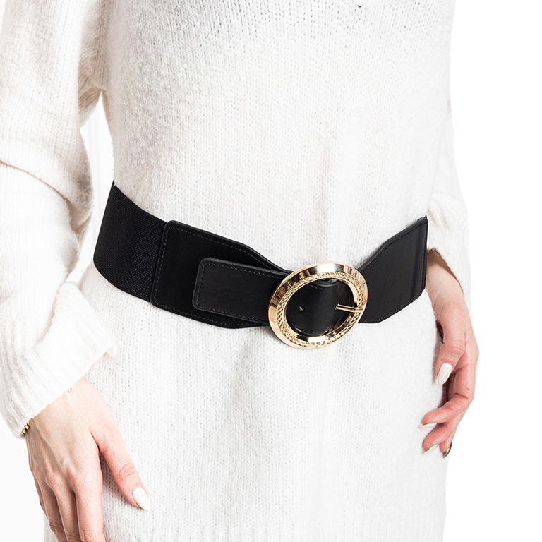• Модний жіночий ремінь із золотою пряжкою. Виготовлений з поєднання екологічної шкіри та резинки. Ця чудова модель ідеально поєднується з сукнями та штанами.