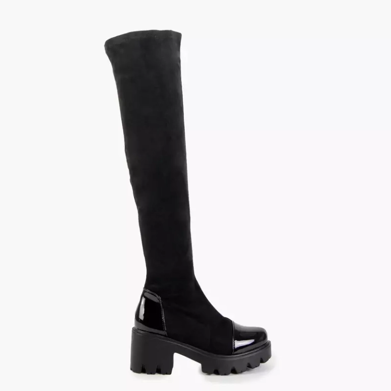 - Сенсаційні жіночі черевики на платформі, виготовлені з еко-замші. Устілка та внутрішня сторона взуття обшиті тканиною. Неутеплена модель, зсувається за коліно. Ніс прикрашений лакованою вставкою. Примітка: виріб має подряпини на матеріалі.