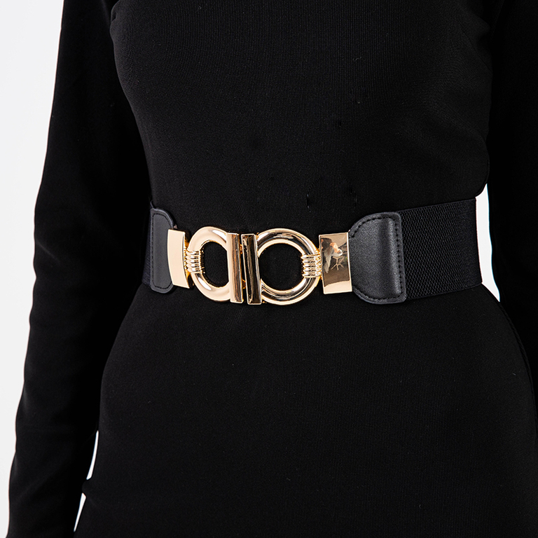 • Чудовий жіночий ремінь з великою золотою пряжкою, виготовлений з поєднання екологічної шкіри та гуми. Ця приваблива модель ідеально поєднується з сукнями та штанами.