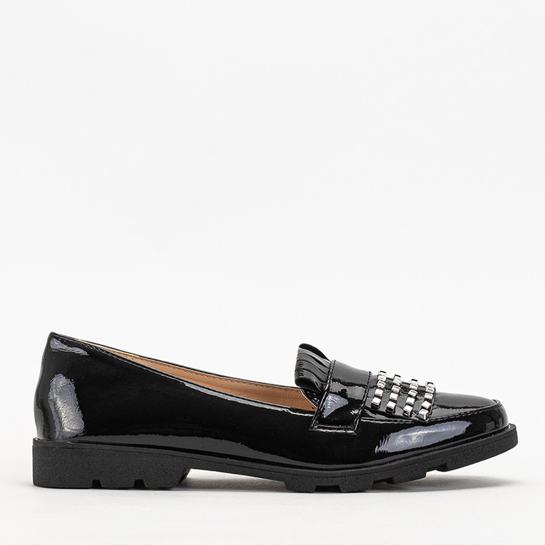 - Класичні жіночі лофери з модними елементами. Виготовлені з лакованої екологічної шкіри. Модель оздоблена бахромою й заклепками срібного кольору. Стильна пара, яка легко буде поєднуватись з базовим гардеробом!