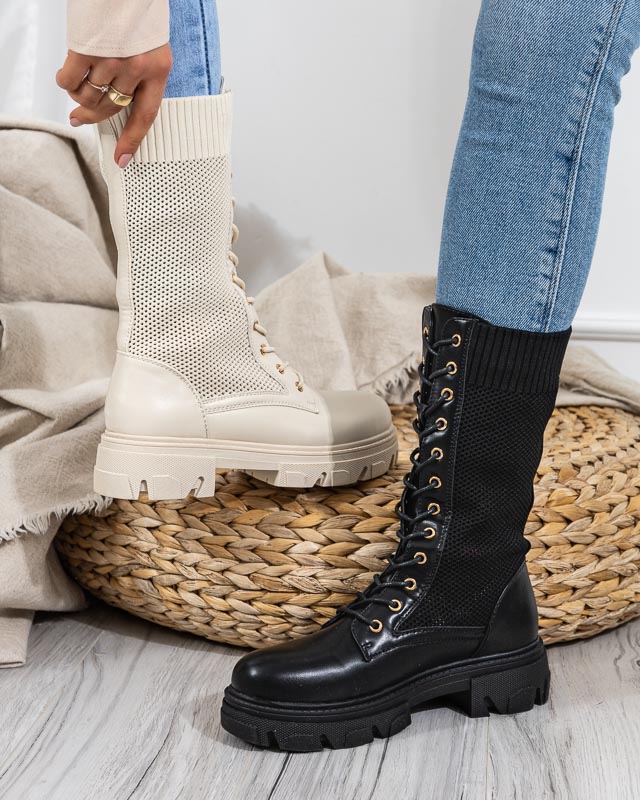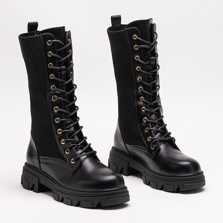 • Жіночі чоботи з екологічної шкіри з ажурним верхом з еластичної тканини. Модель має вставку з екошкіри всередині. ЖІНОЧЕ ЧОРНЕ ВЗУТТЯ НЕПОЛИВНІ БУХОМІ