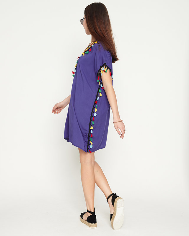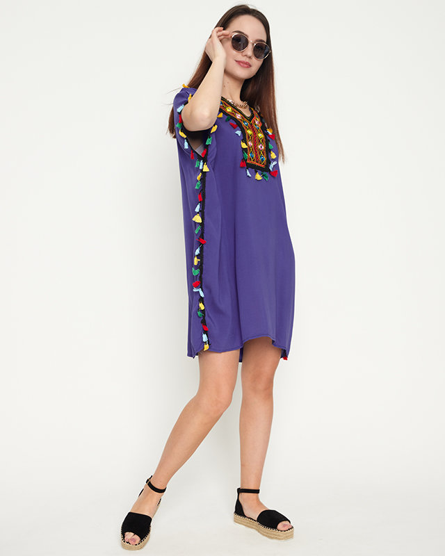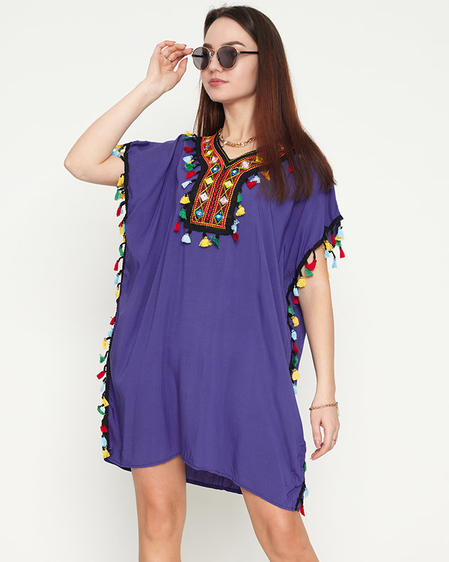 - Легка і приємна на дотик жіноча пляжна туніка з бавовняної тканини. Модель з V-подібним вирізом прикрашена різнокольоровими китицями. Оверсайз підійдуть до будь-якої фігури! ПРИМІТКА: Точність вимірювання (+/-) 1 см.