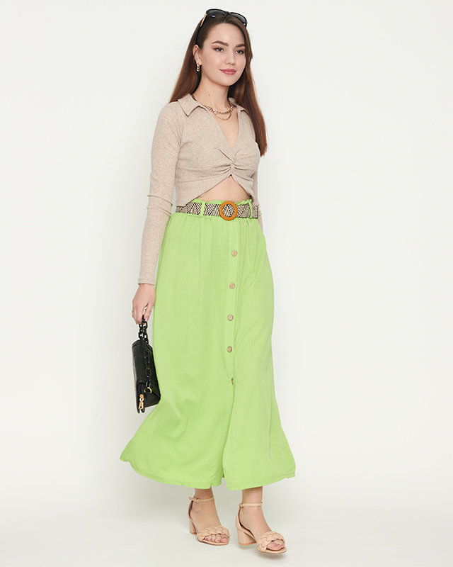 - Жіноча спідниця довжини міді. Виконана з приємного бавовняного матеріалу. В поясі еластична резинка та плетений ремінь. Модель застібається на ґудзики.