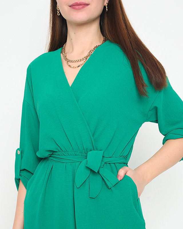 - Модний жіночий комбінезон з довгими розкльошеними рукавами. Ноги прямі і широкі, виріз горловини серапе з конвертом спереду. Талія на резинці та декоративній планці. ПРИМІТКА: Похибка вимірювання (+/-) 1 см.
