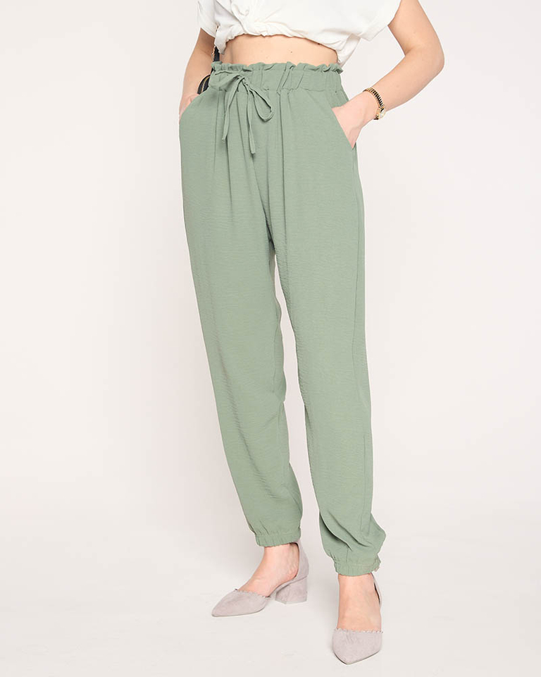 - Жіночі тканинні штани з повітряної та ніжної бавовни. Модель має еластичну талію та штани, а на талії – декоративні зав’язки. ПРИМІТКА: Точність вимірювання (+/-) 1 см.