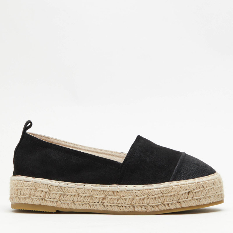 - Чудові еспадрільі чорного кольору з екологічної замші. Носок оздоблений екологічною шкірою з тваринним тисненням. Підошва покрита плетеним джутовим шнуром. Примітка: матеріал має забруднення.