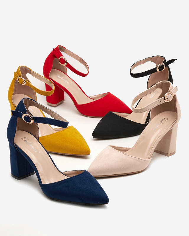- Класичні жіночі босоніжки на шпильці, виготовлені з екологічної замшової шкіри. Виріб застібається на пряжку на рівні щиколотки, має устілку з екологічної шкіри. Примітка: матеріал має забруднення.