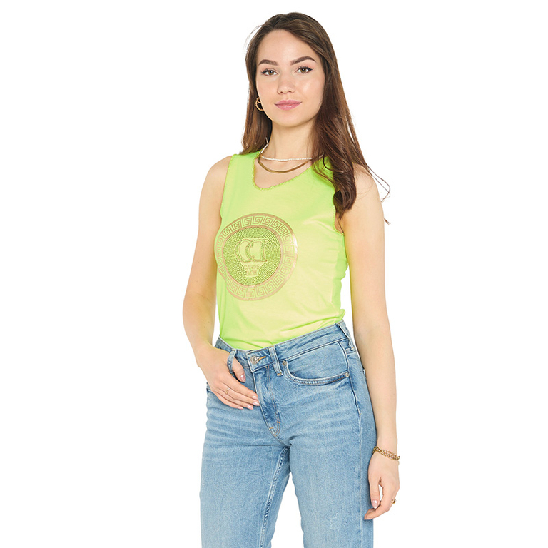 Неоновий жовтий топ на бретелях з принтом і цирконами
